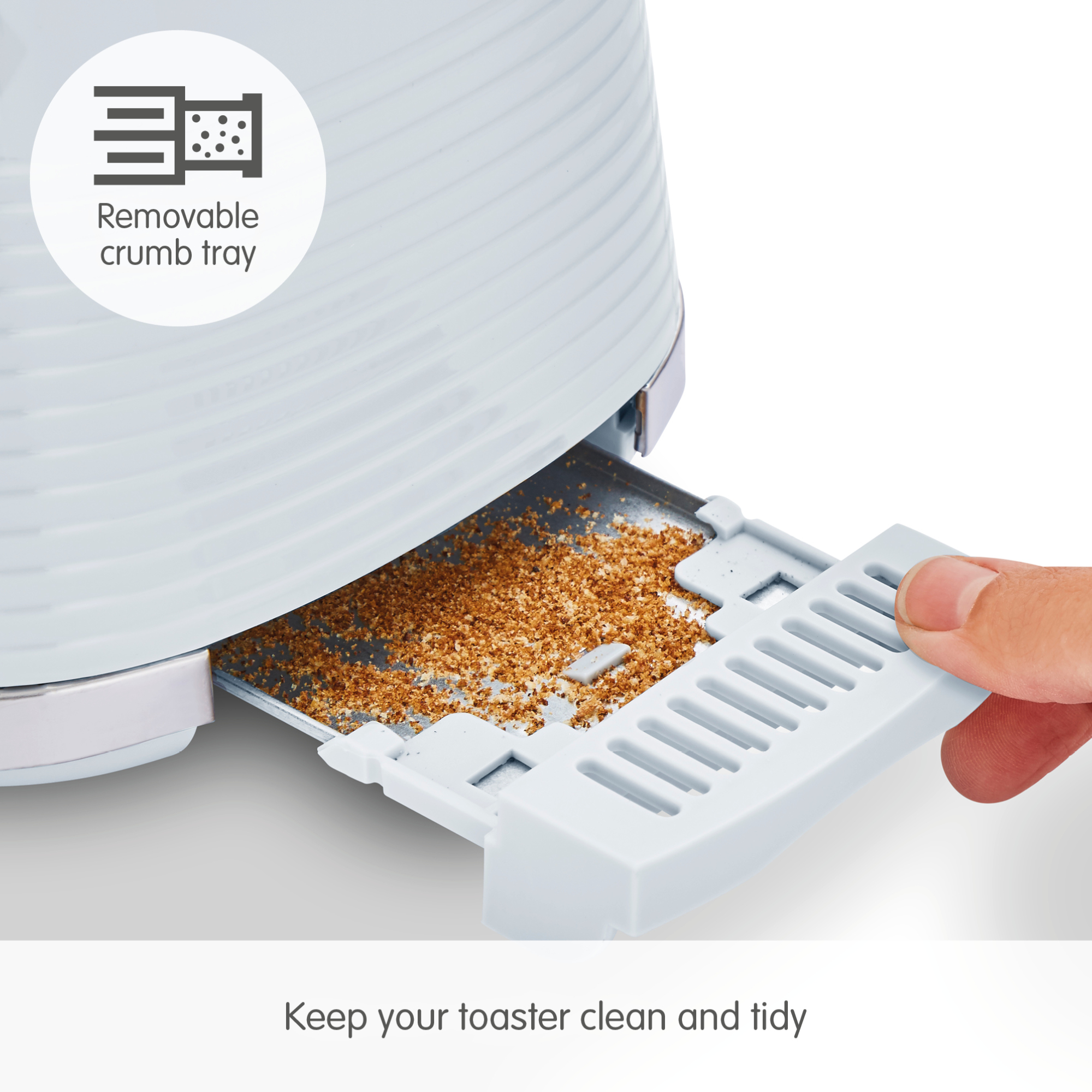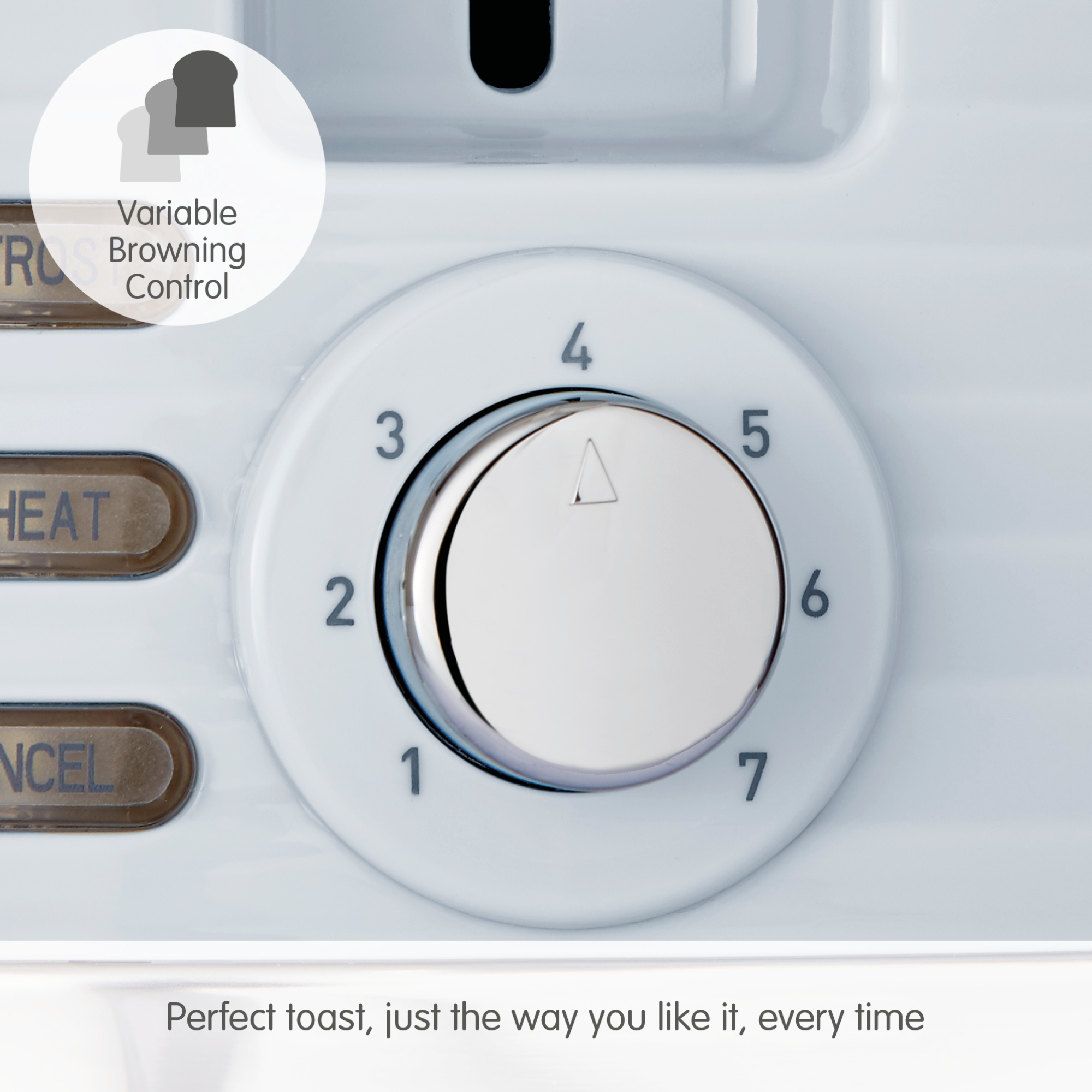 Give your kitchen breathe of fresh air with 'Dune' range, Morphy Richards toaster. Featuring a textured, glossy plastic finish; hosting a simple but sweeping aesthetic for any kitchen worktop. The Dune 2-Slice toaster is simple to operate with a variable browning dial which ensures that your toast is perfect every time. Also, this Morphy Richards toaster boasts a defrost and re-heat setting, which allows you to heat your toast to your desire from a frozen or cooked state.
