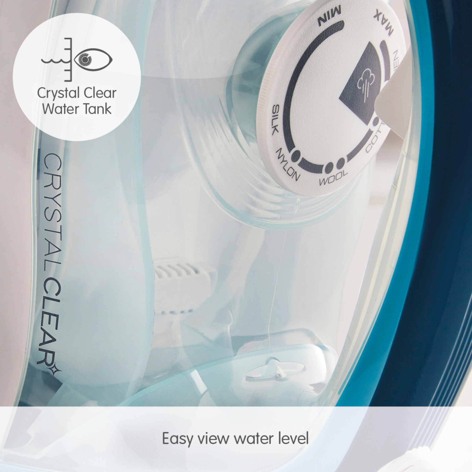 Crystal Clear Water Tank: Avoid overflowing and running out of water whilst ironing with the easy view water tank