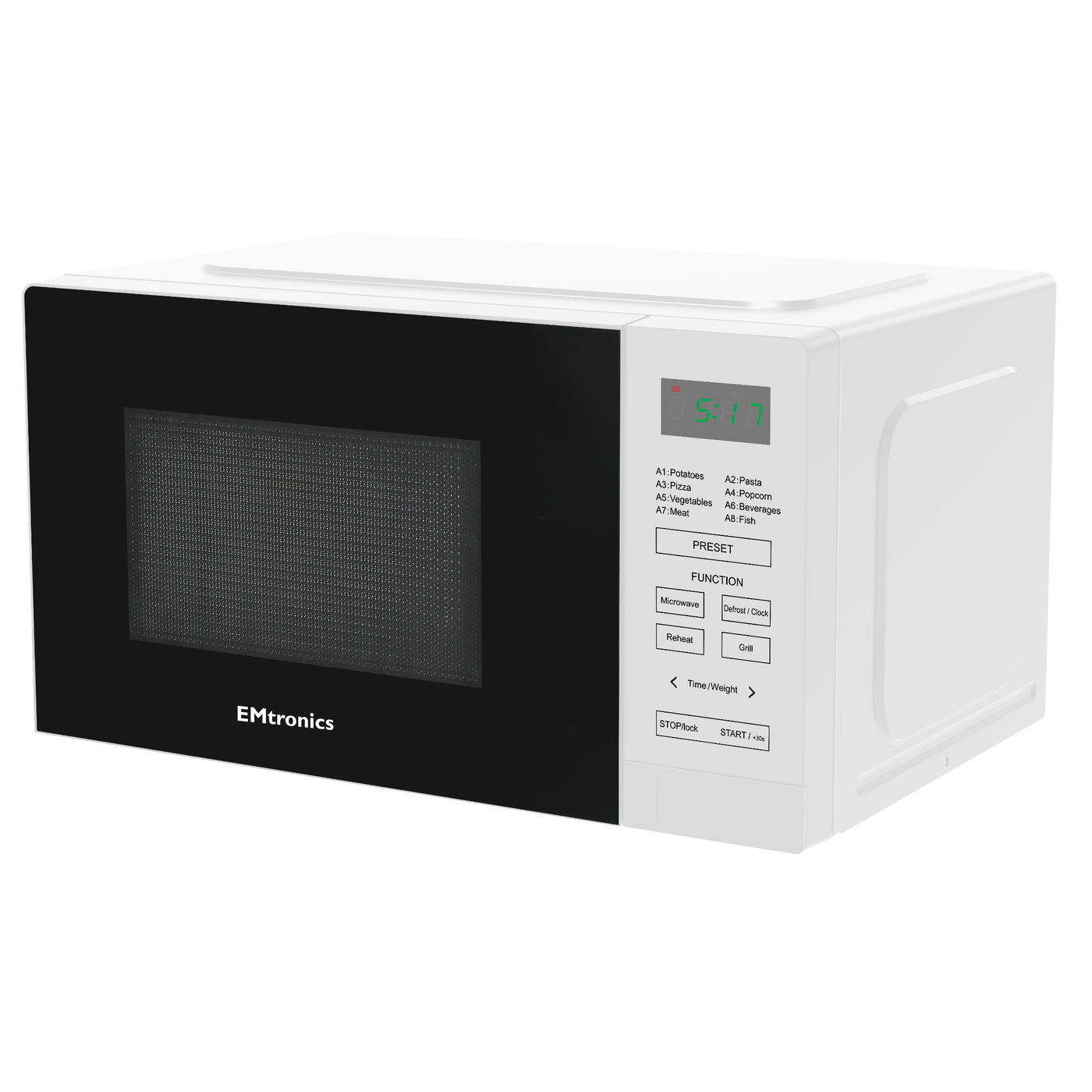 EMtronics 20 Litre White 700W Microwave With 800W Grill, Timer and Preset Menu