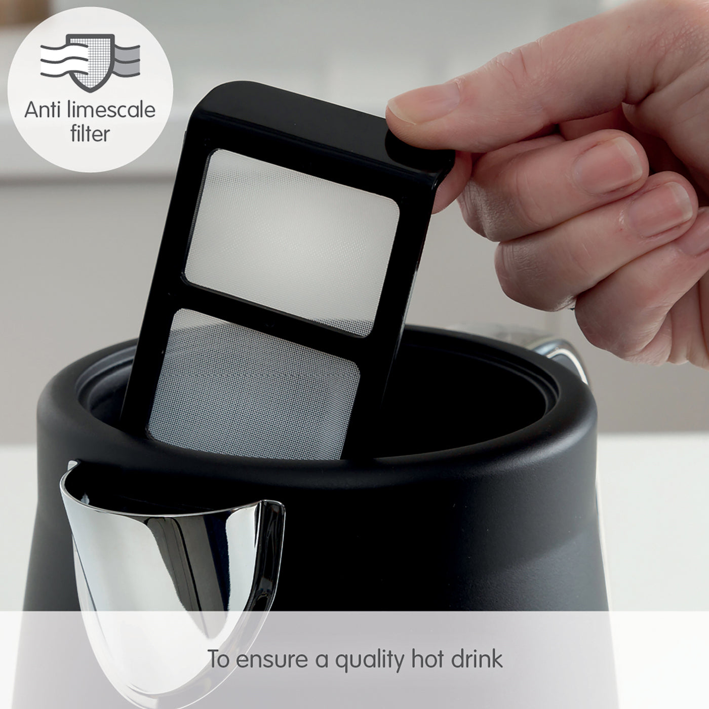 Add a touch of light to your kitchen with the 'Illumination' electric jug kettle by Morphy Richards. Holding a 1.7L capacity, this kettle is great for brewing hot drinks for yourself or the whole household. Not to mention the 3kW power element allows you to create your perfect hot drink in a matter of seconds (45 seconds - 235ml / one cup). Striving to improve the overall drinking experience, Russell Hobbs have fitted a uniquely designed limescale filter; making sure that each drink is high quality and to your specific taste.