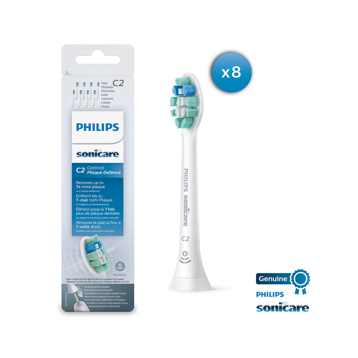 The densely packed, high-quality bristles of this Philips ‘click-on’ brush head removes up to 7 x more plaque than manual toothbrushes. The C2 Optimal Plaque Defence brush head is compatible with the Sonicare smart device application and BrushSync™, which allows you to pair and sync your electric toothbrush and select the optimal brushing intensity for your individual needs – guaranteeing high performance and excellent results. These Philips brush heads become less effective after 3 months of use, but with BrushSync™ you'll be reminded before this happens so you can keep brushing your teeth at an unbelievable standard. Additionally, whilst linked to your smart toothbrush handle, you can track how often and how hard you brush to notify you when it is time to replace the toothbrush head.